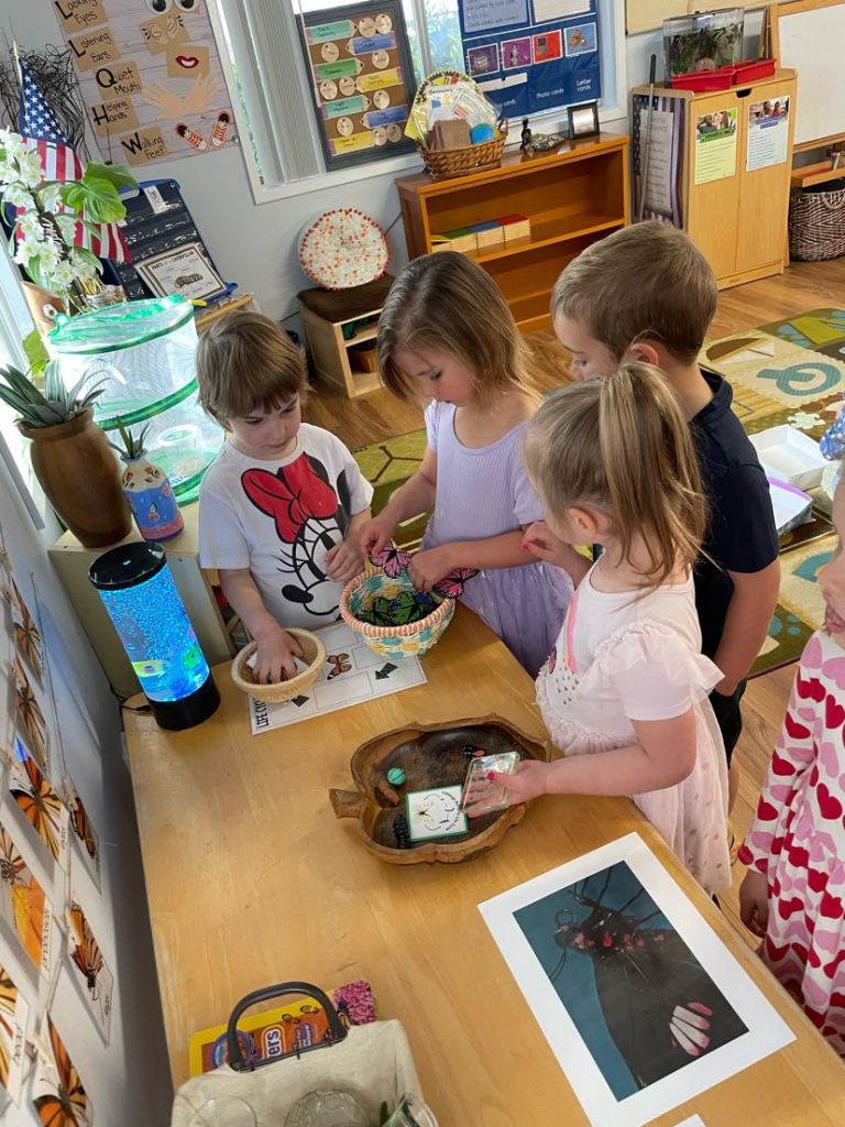 - Sensorial Exercises – Offers children a chance to increase their awareness and discriminate between different sounds, sights, colors, shapes, tastes, smells, and textures of their world.